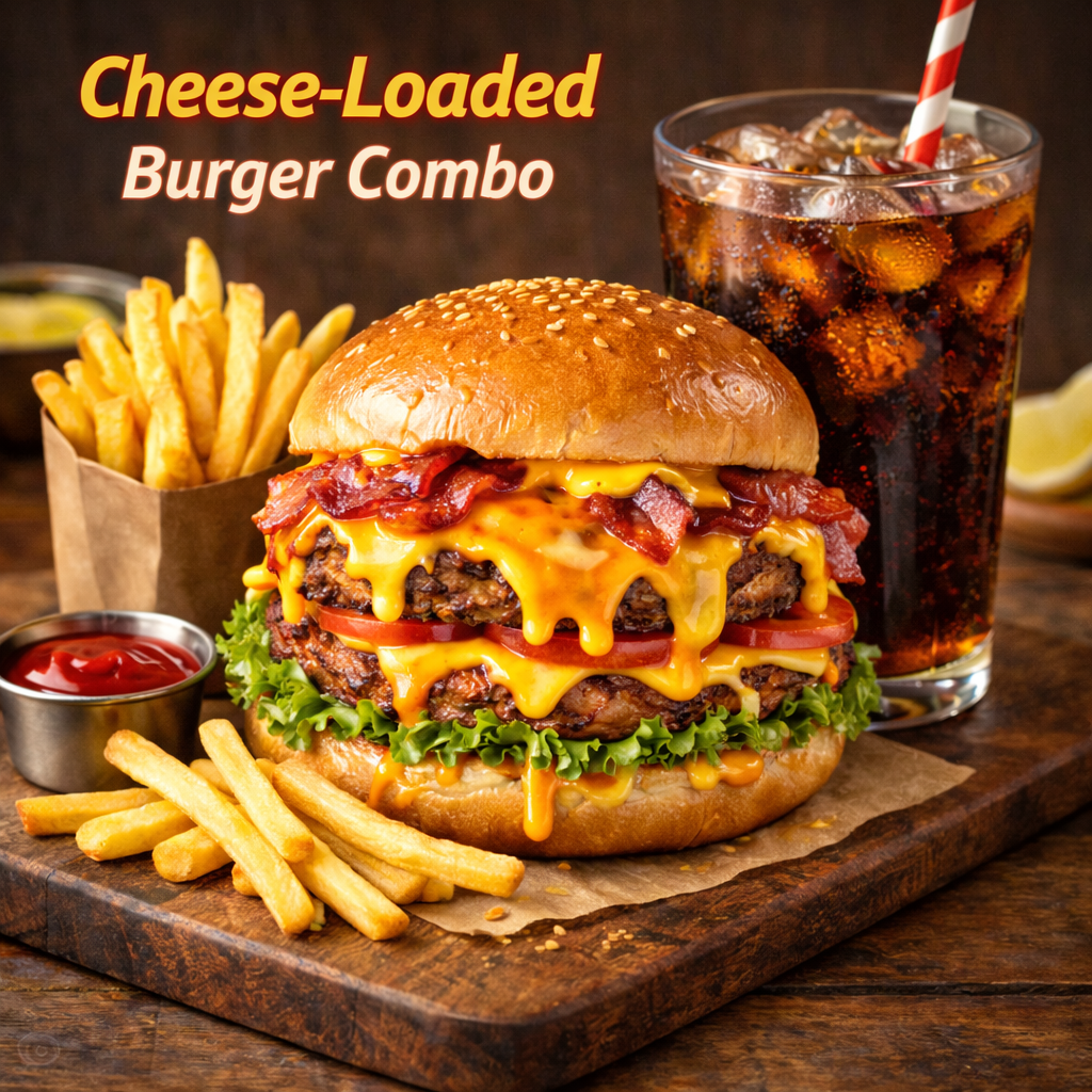 Indulge in pure cheesy goodness with our Cheese-Loaded Burger Combo 🧀🍔