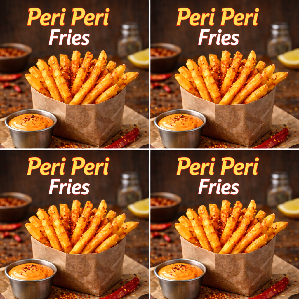 Freshly fried golden potato fries are coated with our special peri peri seasoning — a perfect blend of spicy, tangy, and slightly smoky flavors. Crispy on the outside and soft on the inside, every bite delivers a zesty kick that keeps you coming back for more.