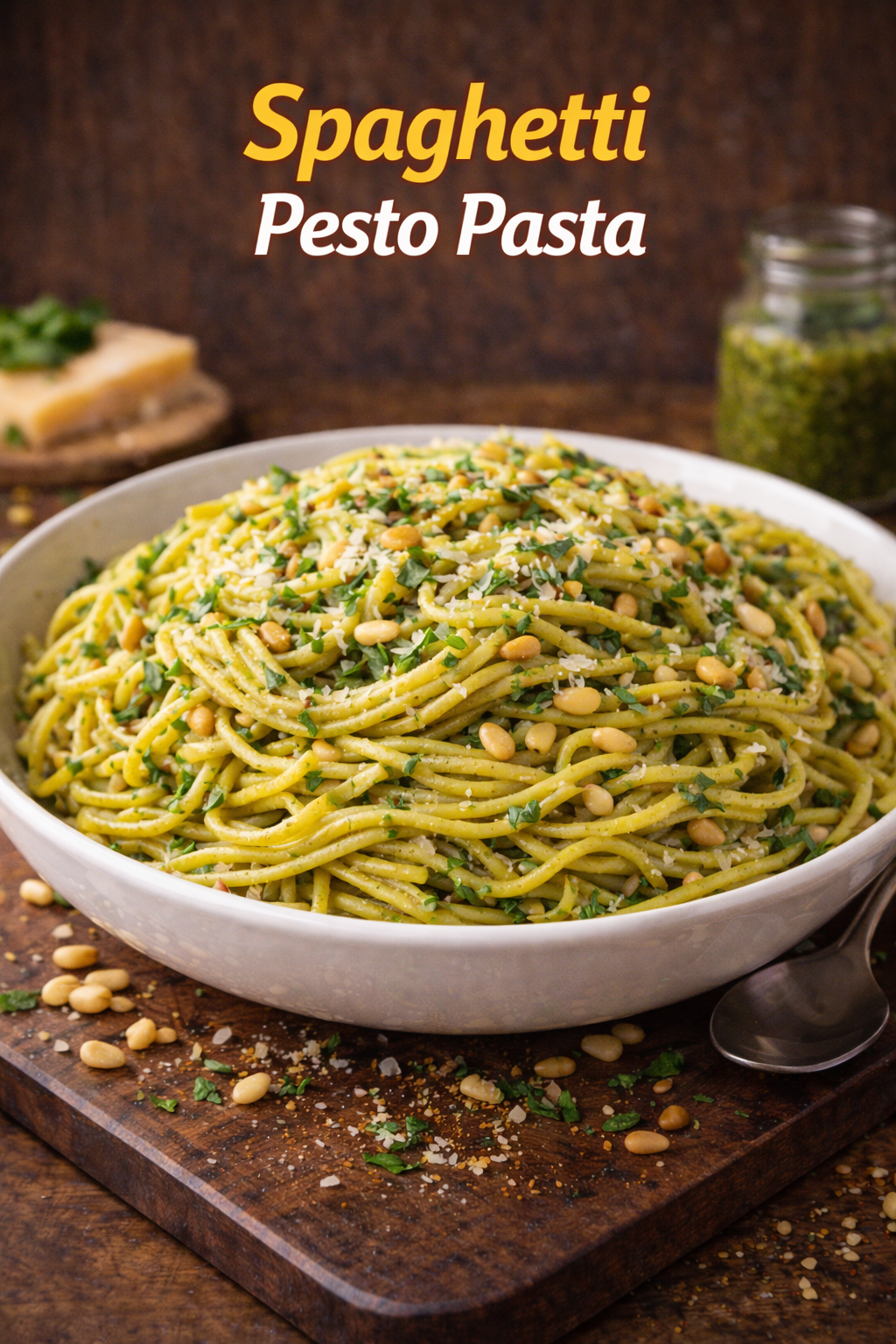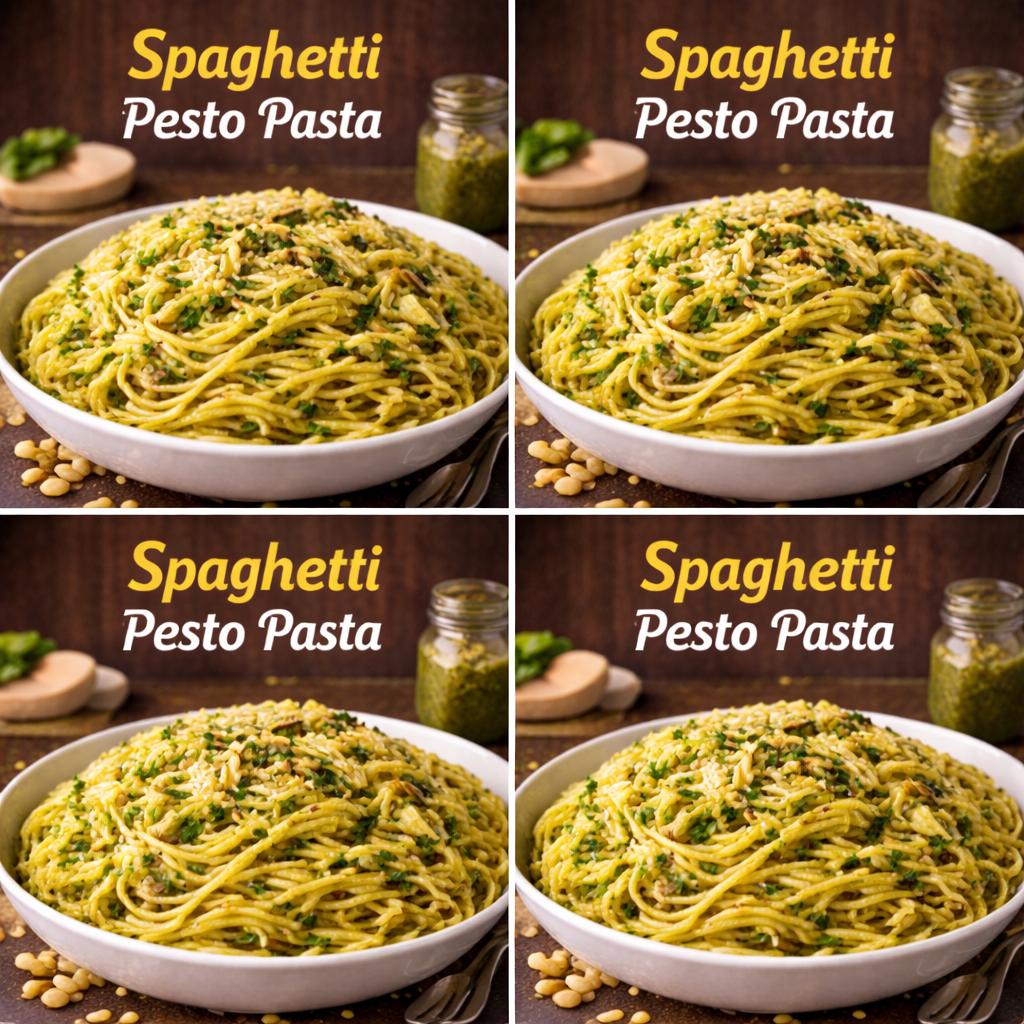 Perfectly cooked spaghetti is tossed in a smooth basil pesto sauce made with fresh basil flavors, olive oil richness, and subtle garlic notes. Finished with a touch of cheese, this pasta delivers a creamy yet refreshing taste in every bite.